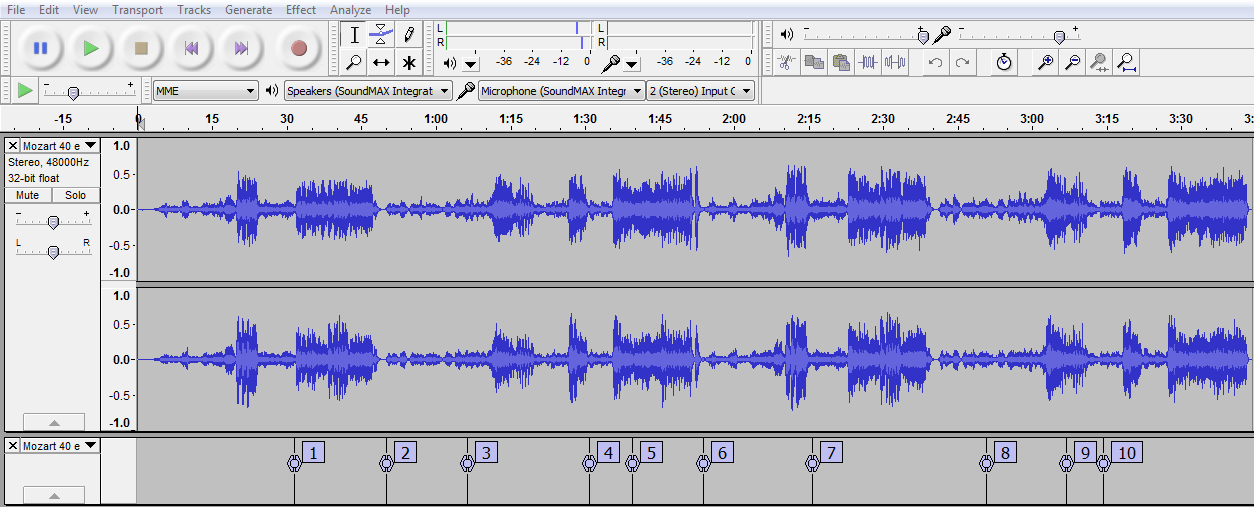 The example below shows an in-class activity used in preparation for the listening assignment on sonata-form expositions (Mozart, Symphony No. 40, the exposition and its repeat). Using vocabulary from our text, students were asked to describe what part of the sonata exposition was taking place at each numerical label and to support their answer with musical details. The entire activity was completed without the aid of a score; the labels in Audacity allowed us to communicate effectively about sections of the piece. While the crux of this activity focused on aural events that signified formal sections (cadences, thematic and textural changes), this activity also modeled how to support an analysis.